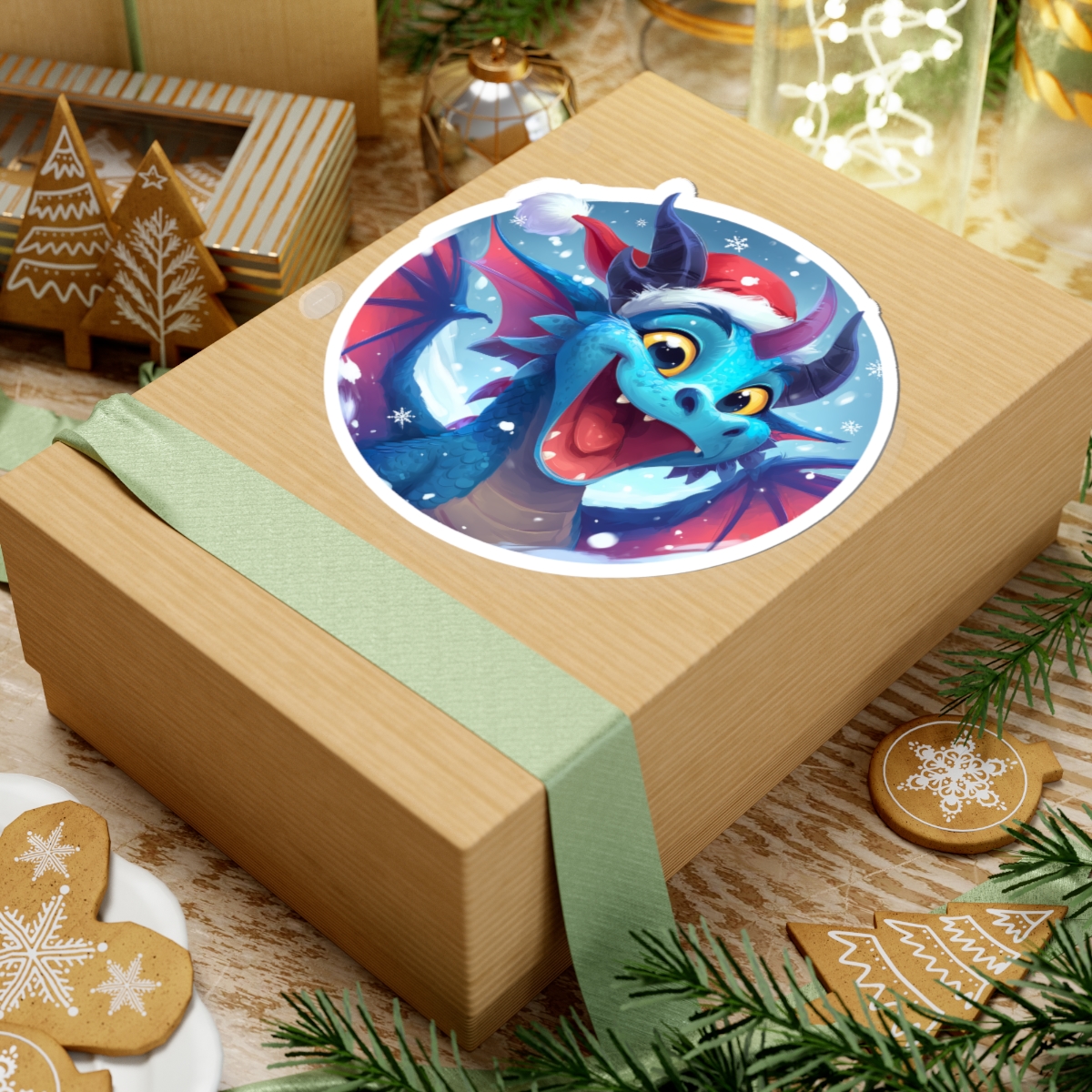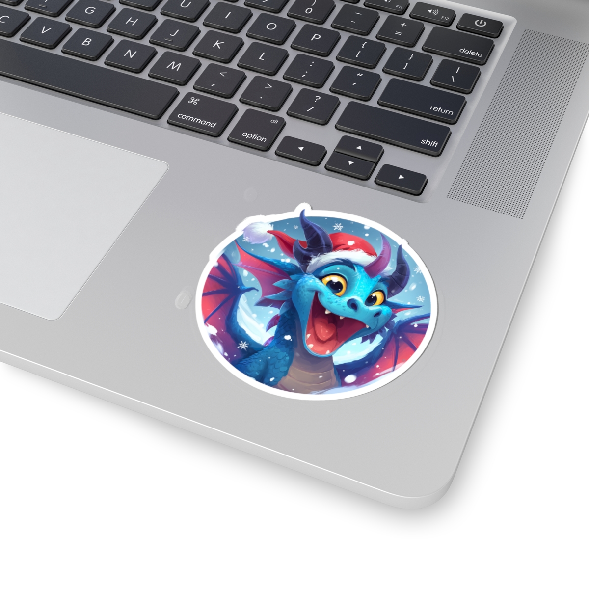 A cheerful, glossy sticker that brings a burst of holiday mischief to everyday surfaces. This kiss-cut vinyl decal features a bright, wide-eyed blue dragon wearing a Santa hat, surrounded by soft snowflakes and frosty tones. The vivid eco-solvent inks make the colors pop against laptops, journals, windows, and more—adding a playful, seasonal vibe wherever it lands. Lightweight and easy to apply, the sticker peels on smoothly and stays put with a strong permanent adhesive, so your little dragon companion can tag along on commutes, study sessions, or cozy winter gatherings. Choose white or transparent backing and pick from four sizes to match your space and style.