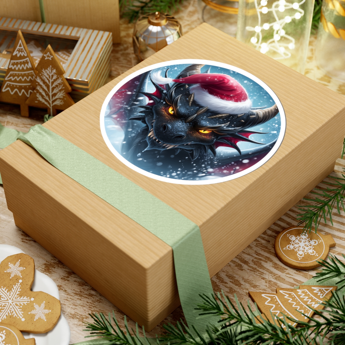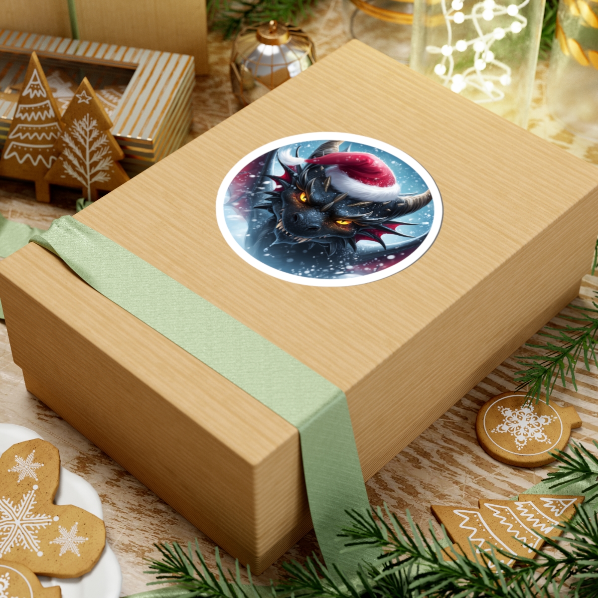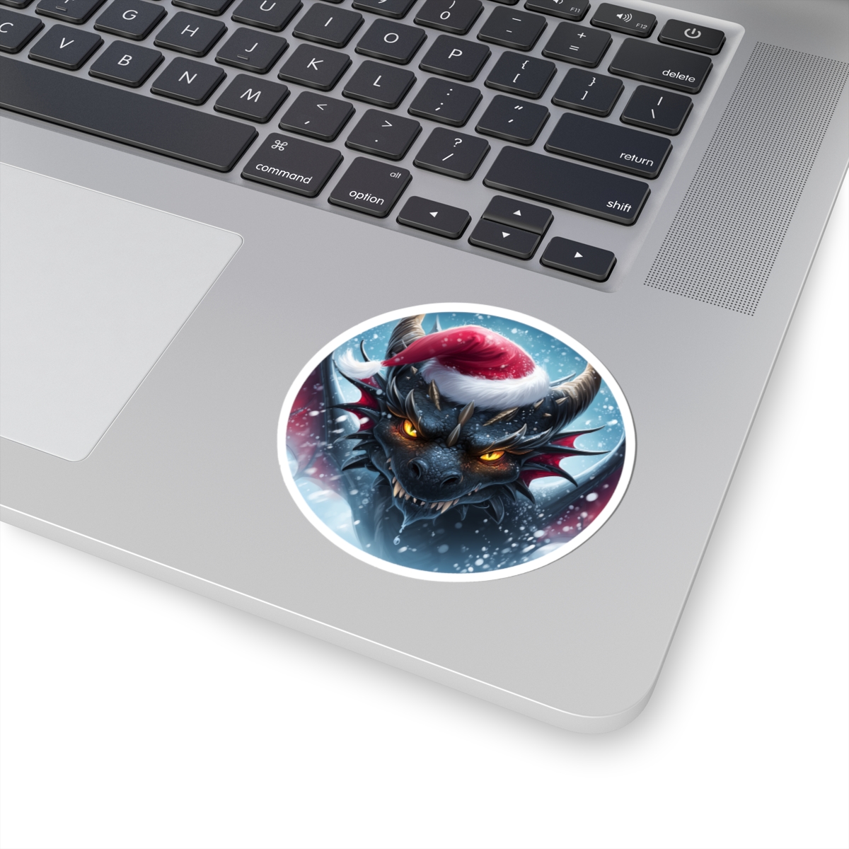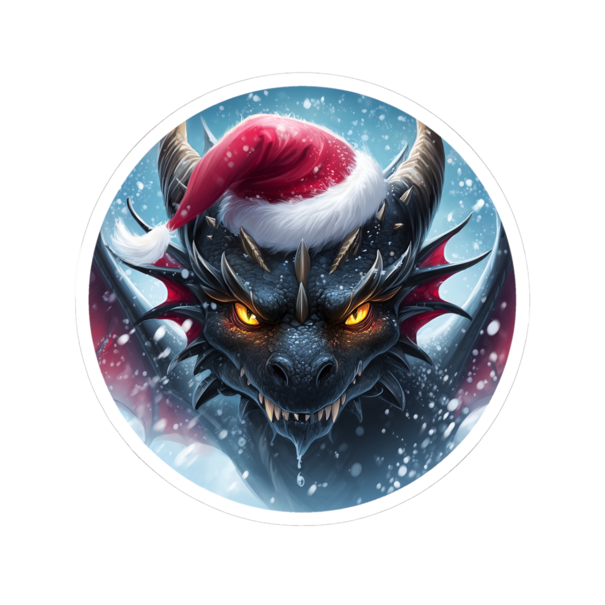 This glossy kiss-cut sticker captures a fierce winter mood — a snarling dragon with glowing amber eyes, frost-tipped scales, and a crooked Santa hat. Its vibrant eco-solvent inks make the blues, reds, and golden highlights pop against the snowy background. Peel-and-stick application is smooth and bubble-free, giving laptops, journals, water bottles (indoor use), or holiday décor an edgy, playful twist. The sticker reads like a tiny piece of fantasy art that brings a darkly whimsical cheer to holiday gatherings, gaming nights, or seasonal displays in a cozy den.