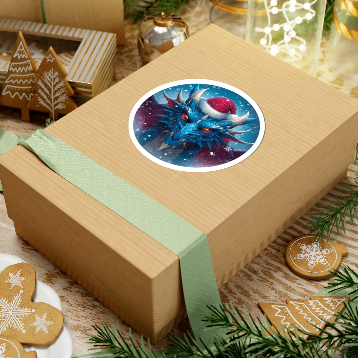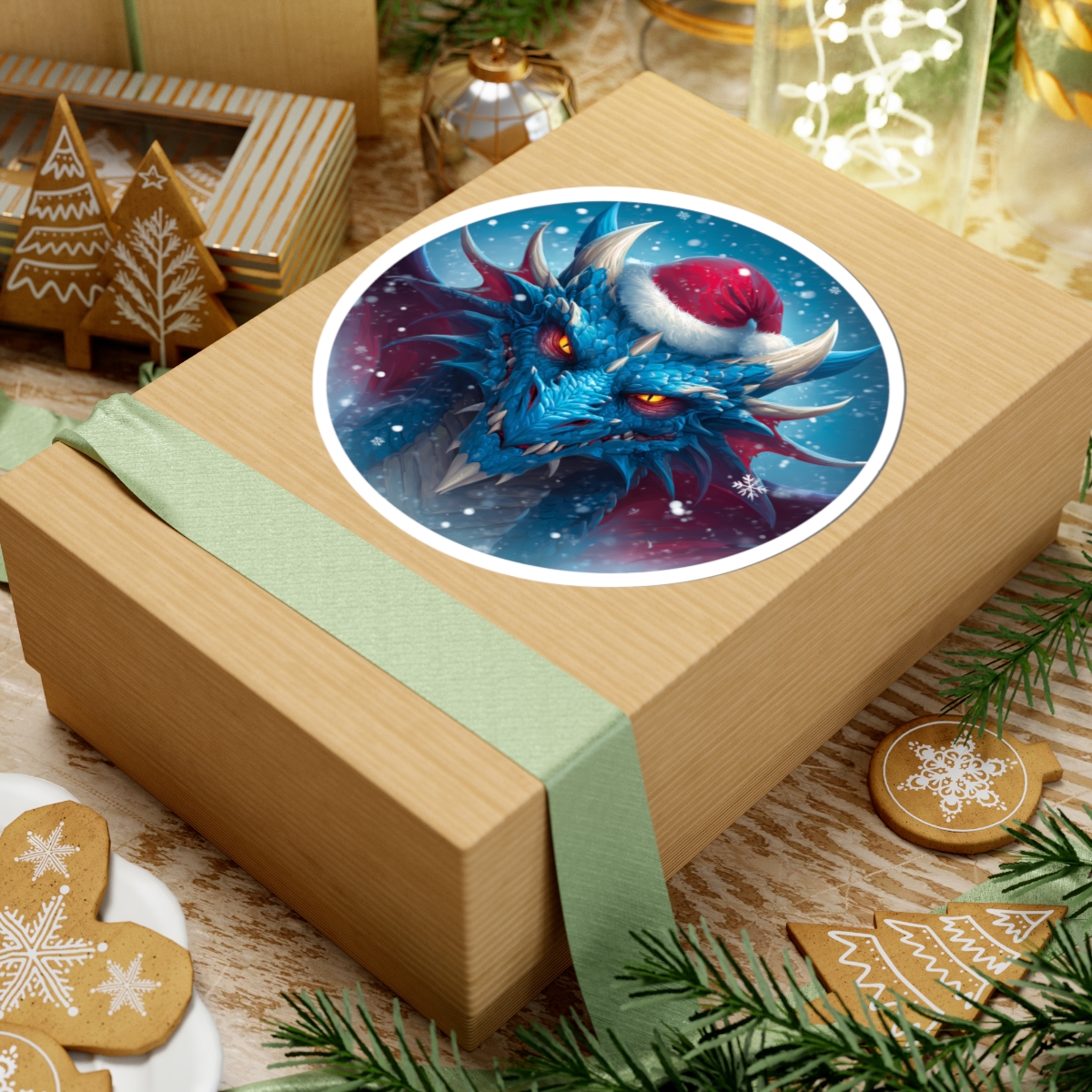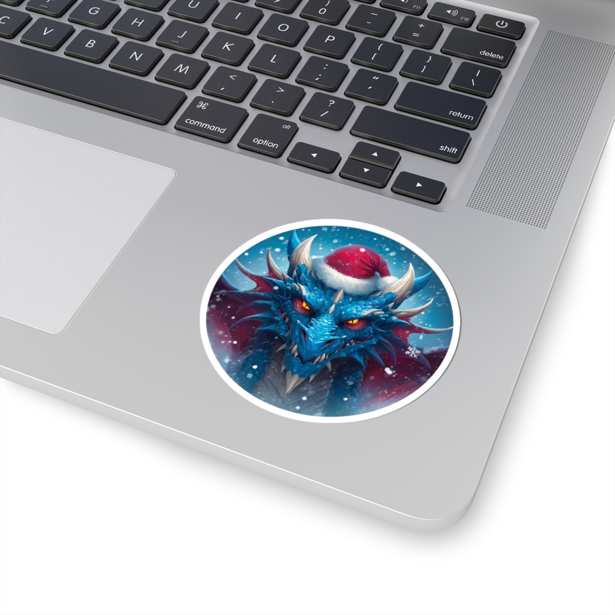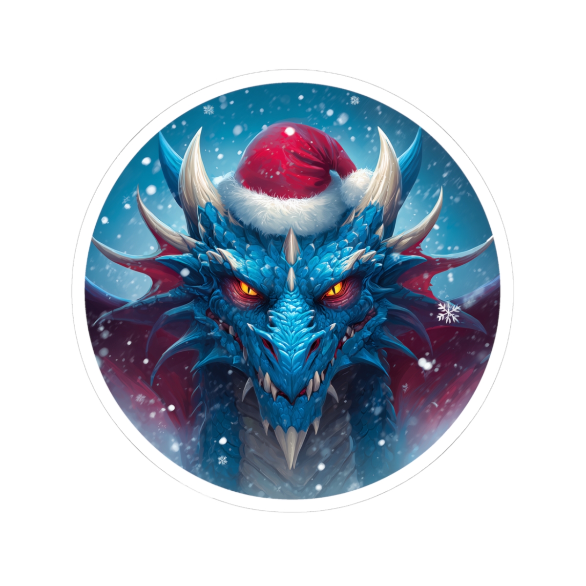 A glossy kiss-cut vinyl sticker featuring a fierce blue dragon wearing a Santa hat, set against a snowy, twilight backdrop. The artwork’s vibrant eco-solvent inks make the dragon’s icy scales and glowing orange eyes pop, while the glossy finish gives the piece a striking, polished look. Durable yet thin, the sticker adheres smoothly to laptops, journals, water-resistant cases, and other flat surfaces with a bubble-free application. Available in white or transparent backgrounds and multiple sizes, this sticker brings a touch of winter fantasy and bold personality to everyday gear.