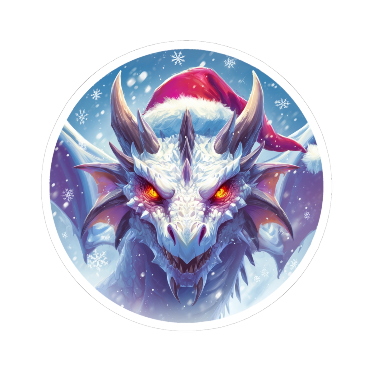 Place it on a laptop before a holiday stream, add it to a journal full of campaign notes, or let it guard the corner of your sketchbook during winter conventions. The art reads both fierce and festive, so it fits into cozy game nights, seasonal craft swaps, and tabletop sessions by the heater. Small enough to layer with other stickers, it’s a bold accent that starts conversations and sparks smiles — especially among dragon fans and fantasy creatives who enjoy a cold-weather twist.