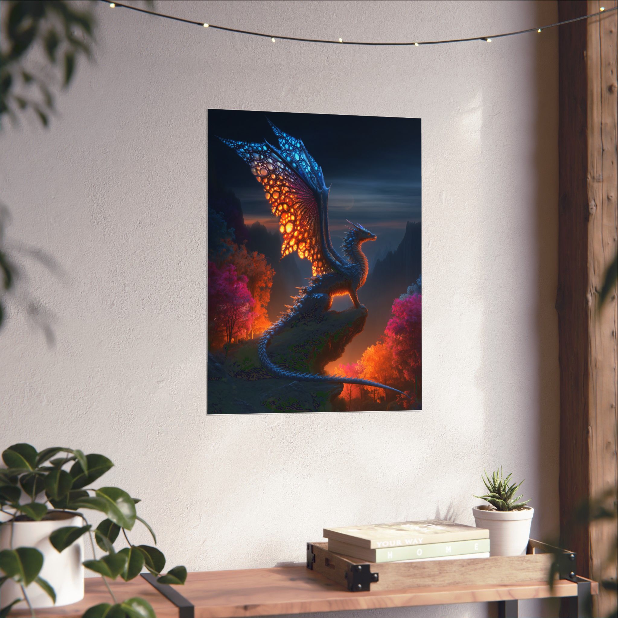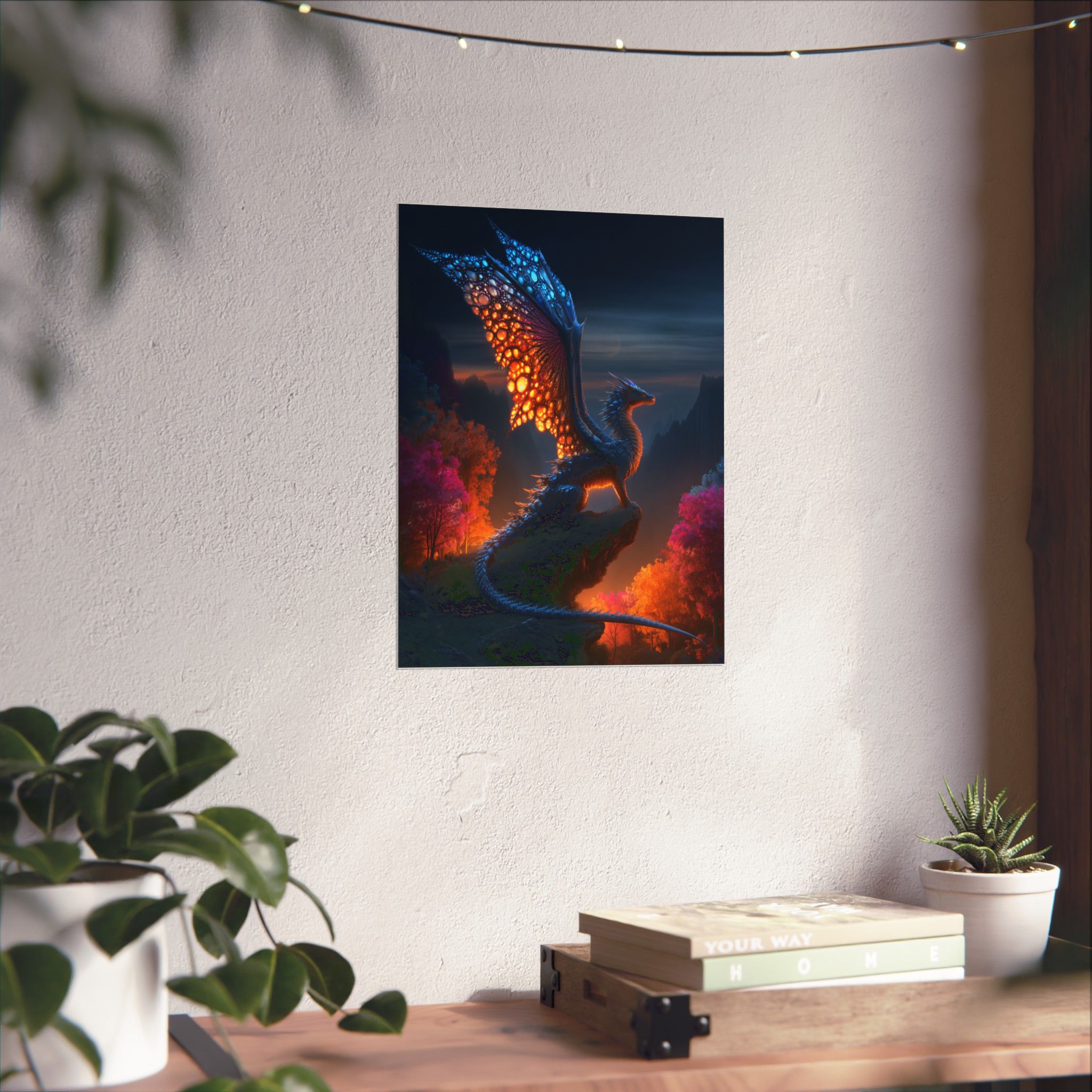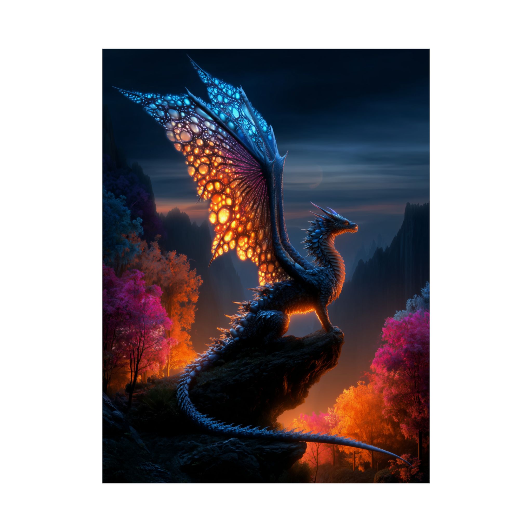 A luminous dragon captured at twilight—this matte vertical poster brings storybook fantasy to your wall with deep jewel tones and soft, light-absorbing texture. Printed on museum-grade archival paper using Giclée inks, the image holds rich contrasts: cobalt skies, ember-gold wing veins, and warm, autumnal foliage that feels alive. Hang it in a reading nook, game den, or studio to summon quiet wonder and a sense of adventure every time you pass by. The matte finish cuts glare so details remain velvety and immersive under indoor lighting, while the archival stock preserves color and clarity for years of quiet storytelling.