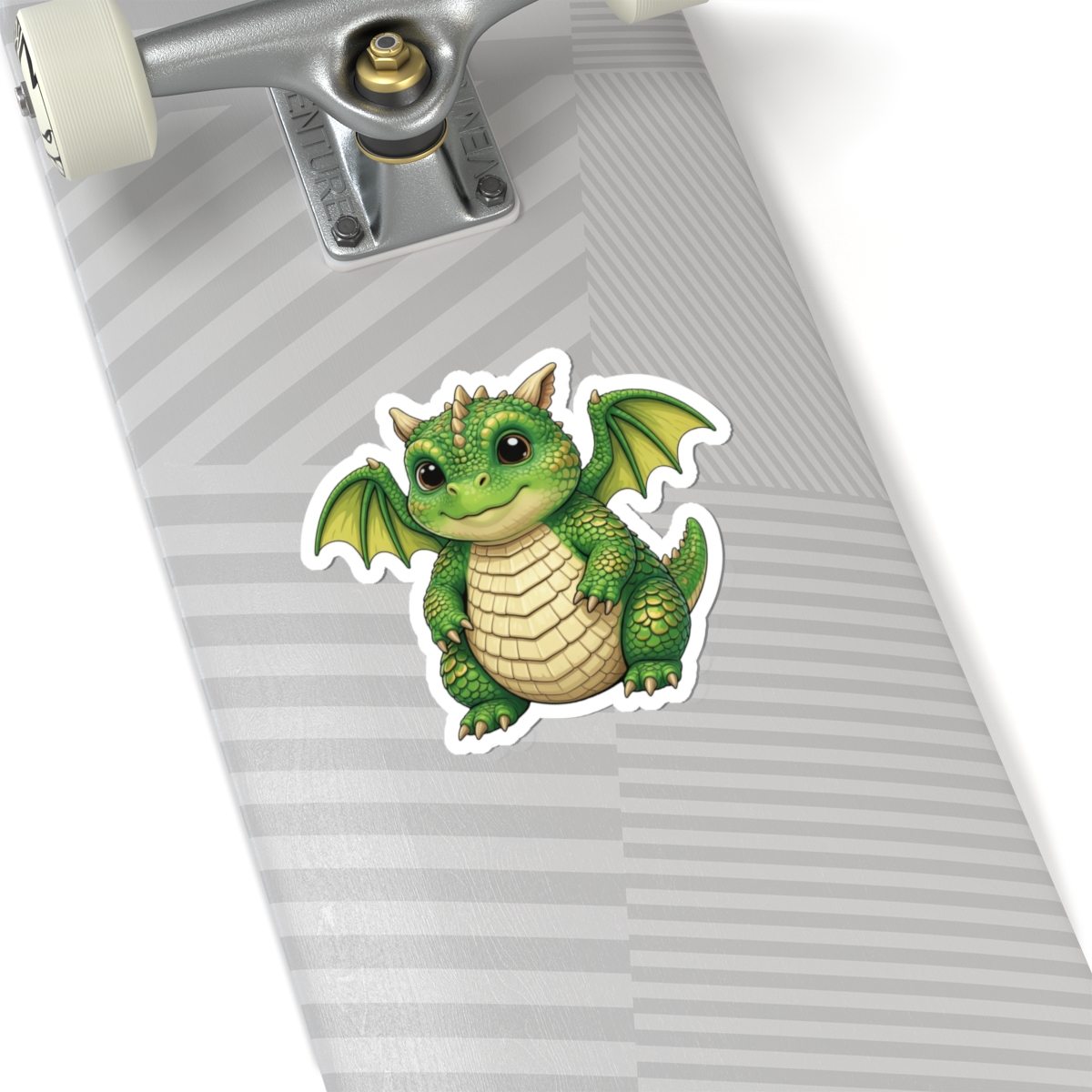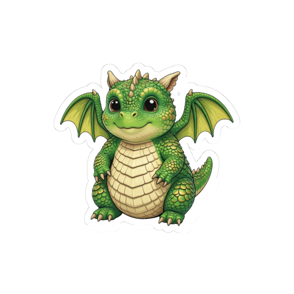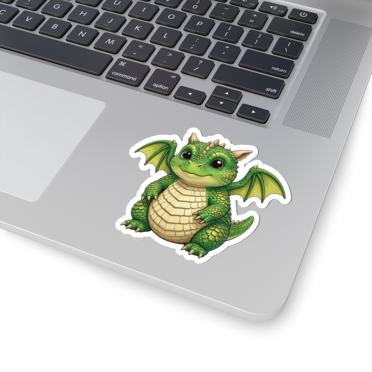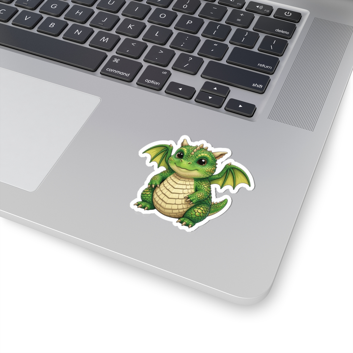 Meet your new tiny companion: a glossy, kiss-cut dragon sticker that brings playful fantasy to everyday things. This chubby green dragon has bright, textured scales and warm, curious eyes — the kind of creature that turns a laptop corner, notebook, or water-bottle into a little story. The glossy finish makes colors pop and gives a polished look while the precise kiss-cut edge keeps the silhouette clean and charming. It sticks smoothly and stays put on flat surfaces, ready to spark smiles during study sessions, craft nights, or while journaling about imaginary quests.