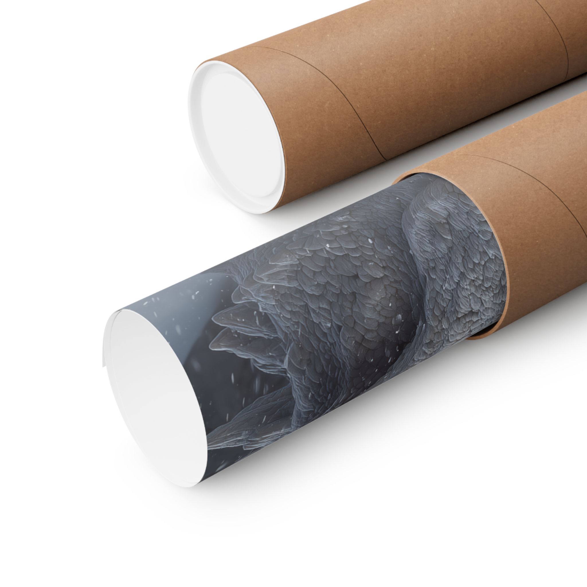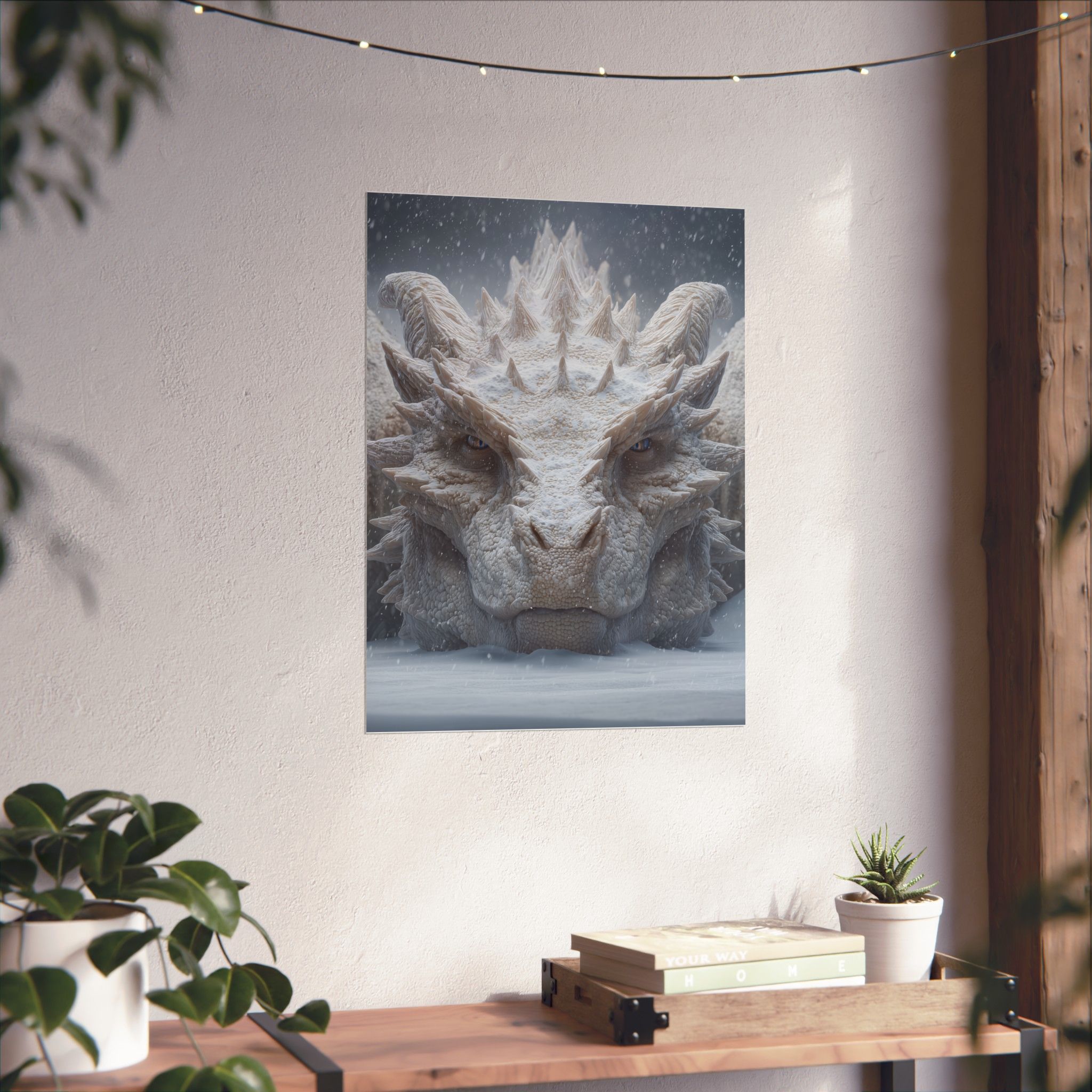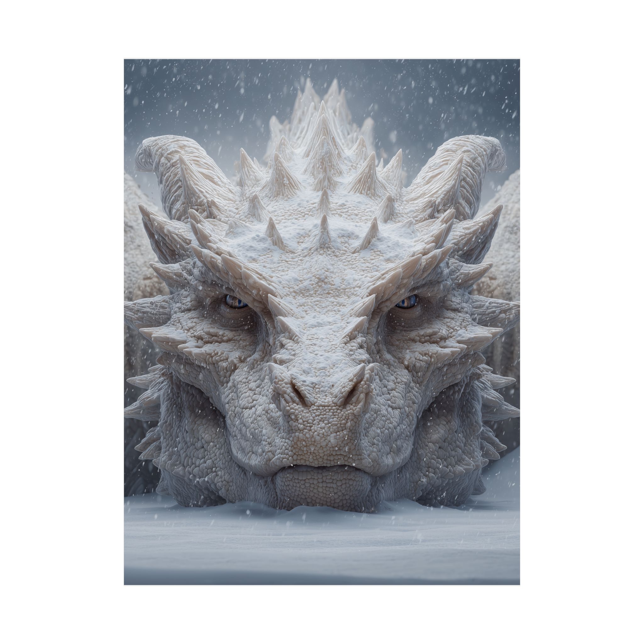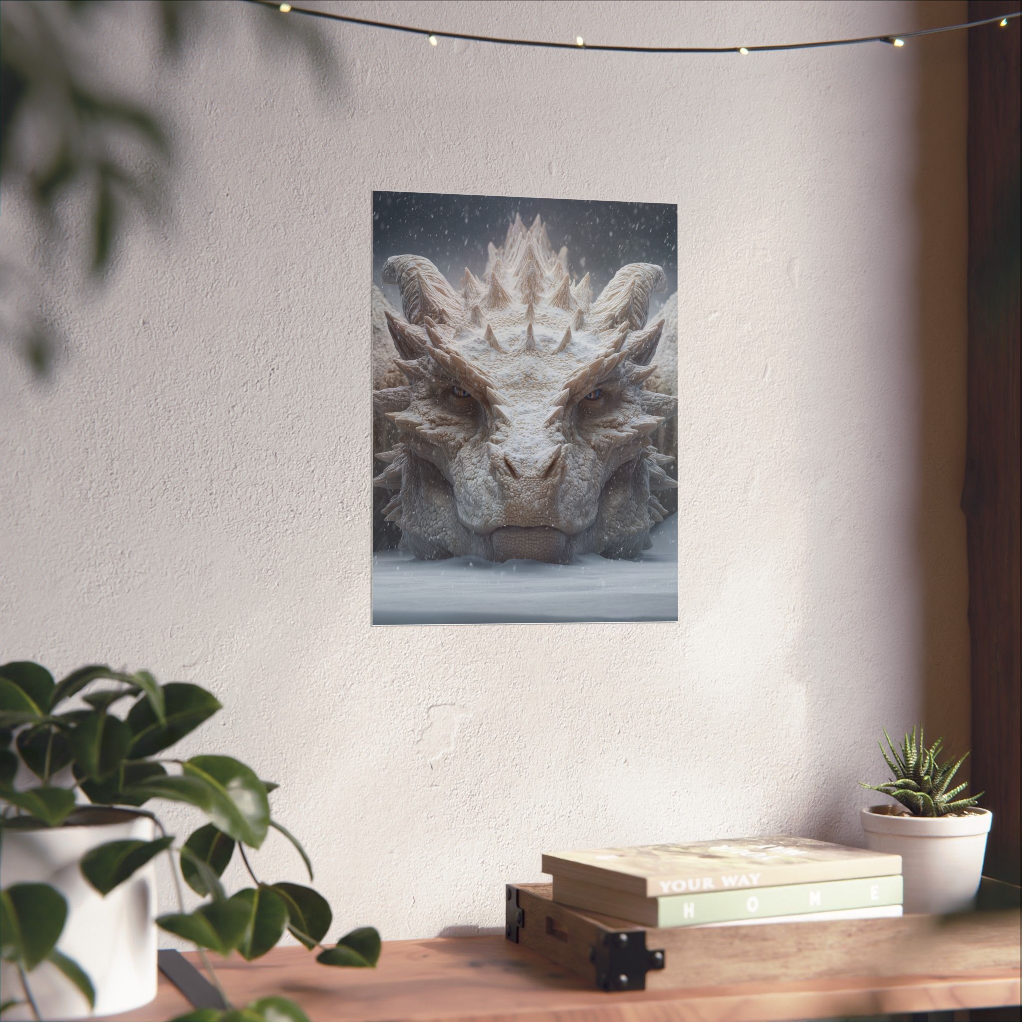 A striking matte vertical poster that brings an icy, fantastical presence into any indoor space. The image captures a snow-dusted dragon’s face in close-up — textured scales, horned ridges, and cold, knowing eyes — rendered with vivid giclée color on museum-grade archival paper. The muted matte finish soaks in light and emphasizes fine detail and depth, creating a quiet, immersive scene that feels like a frozen moment from an epic winter tale. This piece suits collectors of fantasy art, gamers, and anyone who wants a dramatic focal point for a den, studio, or gallery wall during winter months or year-round display.
