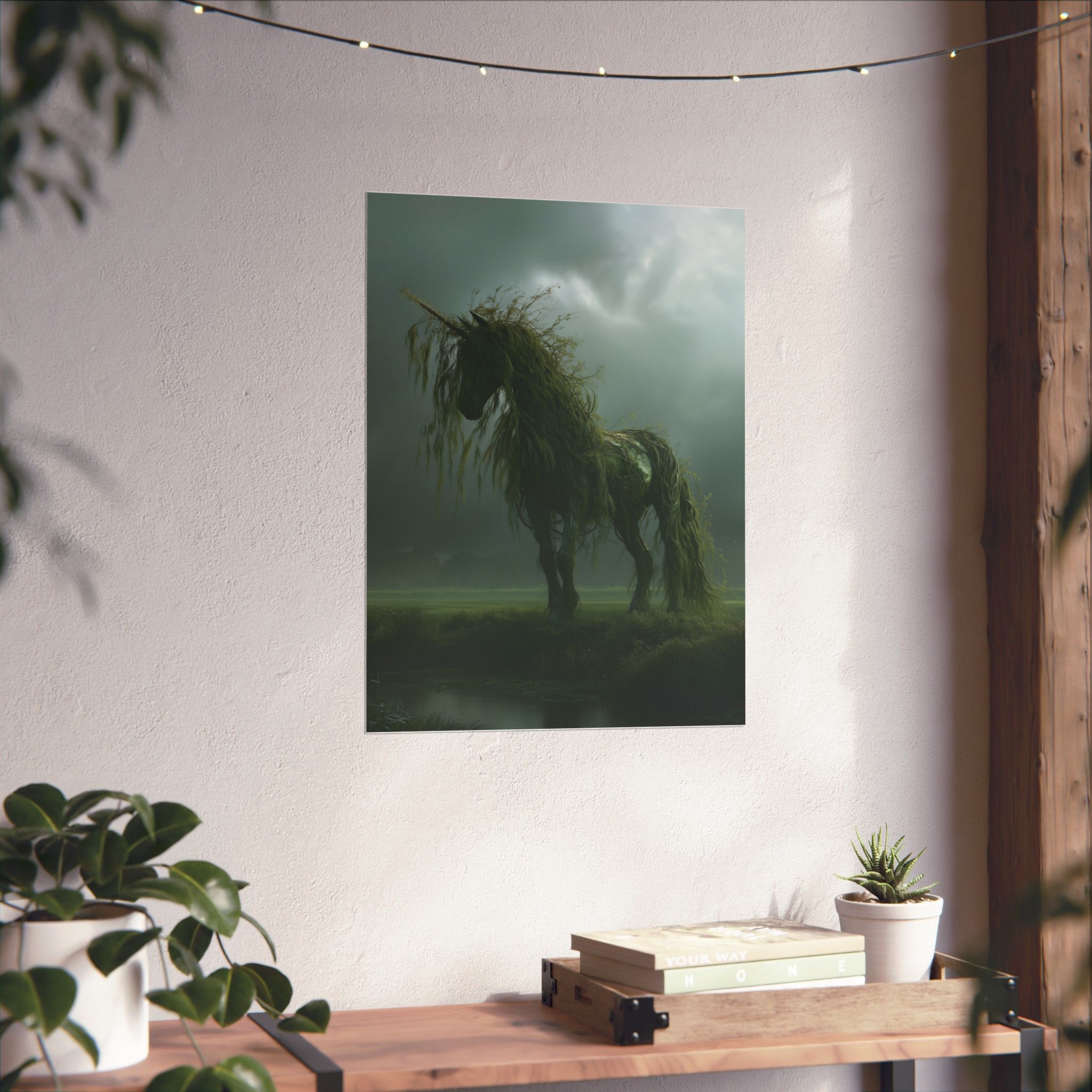 A matte vertical art poster that brings a hushed, otherworldly moment into your space. The image shows a living willow tree unicorn standing on a misty bog beneath low, stormy skies — a quiet meeting of folklore and wild nature. The matte finish absorbs glare so the deep greens, shadowed grays, and subtle highlights read like a painting from every angle. Printed on archival museum-grade paper with giclée inks, colors stay rich and lifelike over time. Hang it in a study, reading nook, or gallery wall to invite a slow, reflective mood and a touch of woodland myth.
