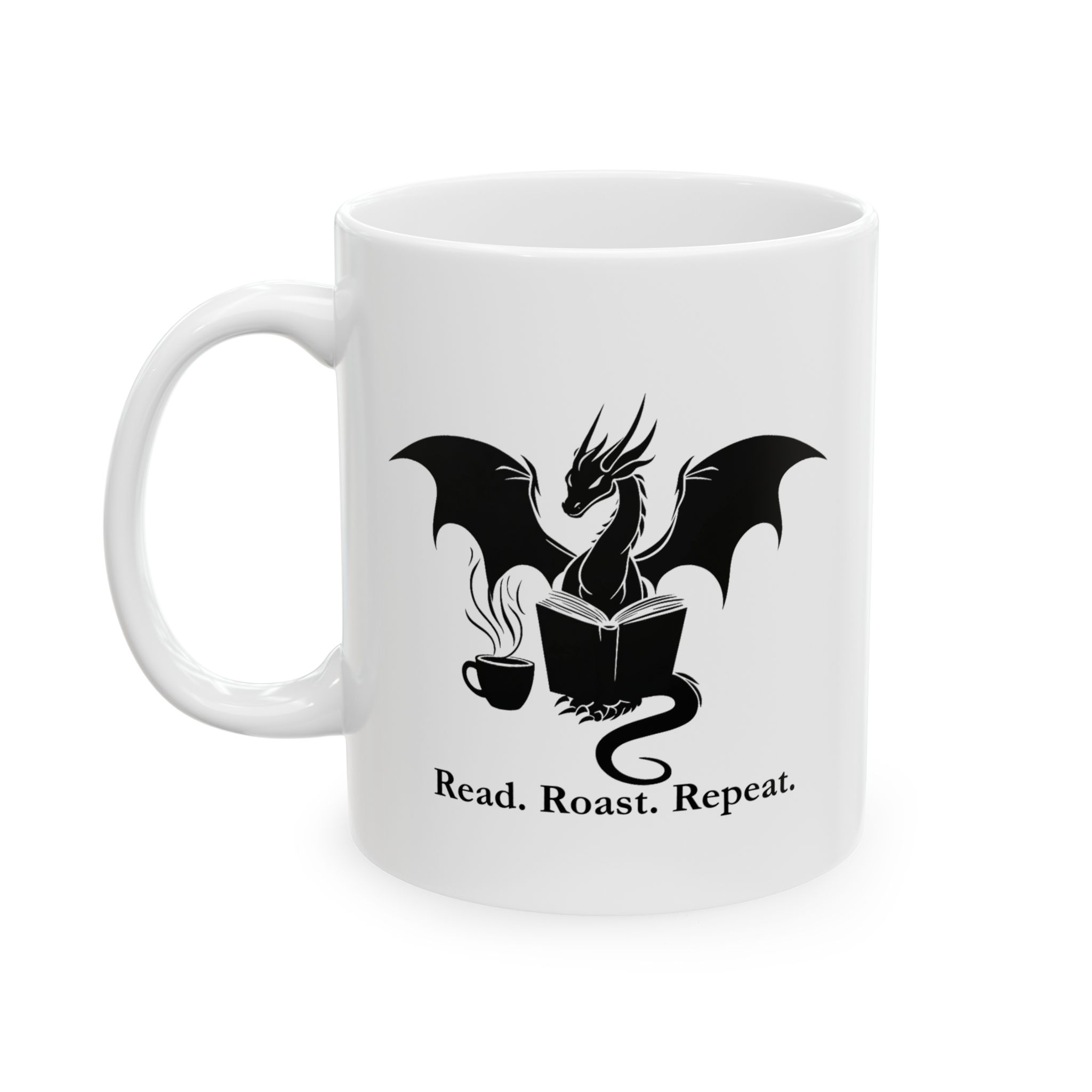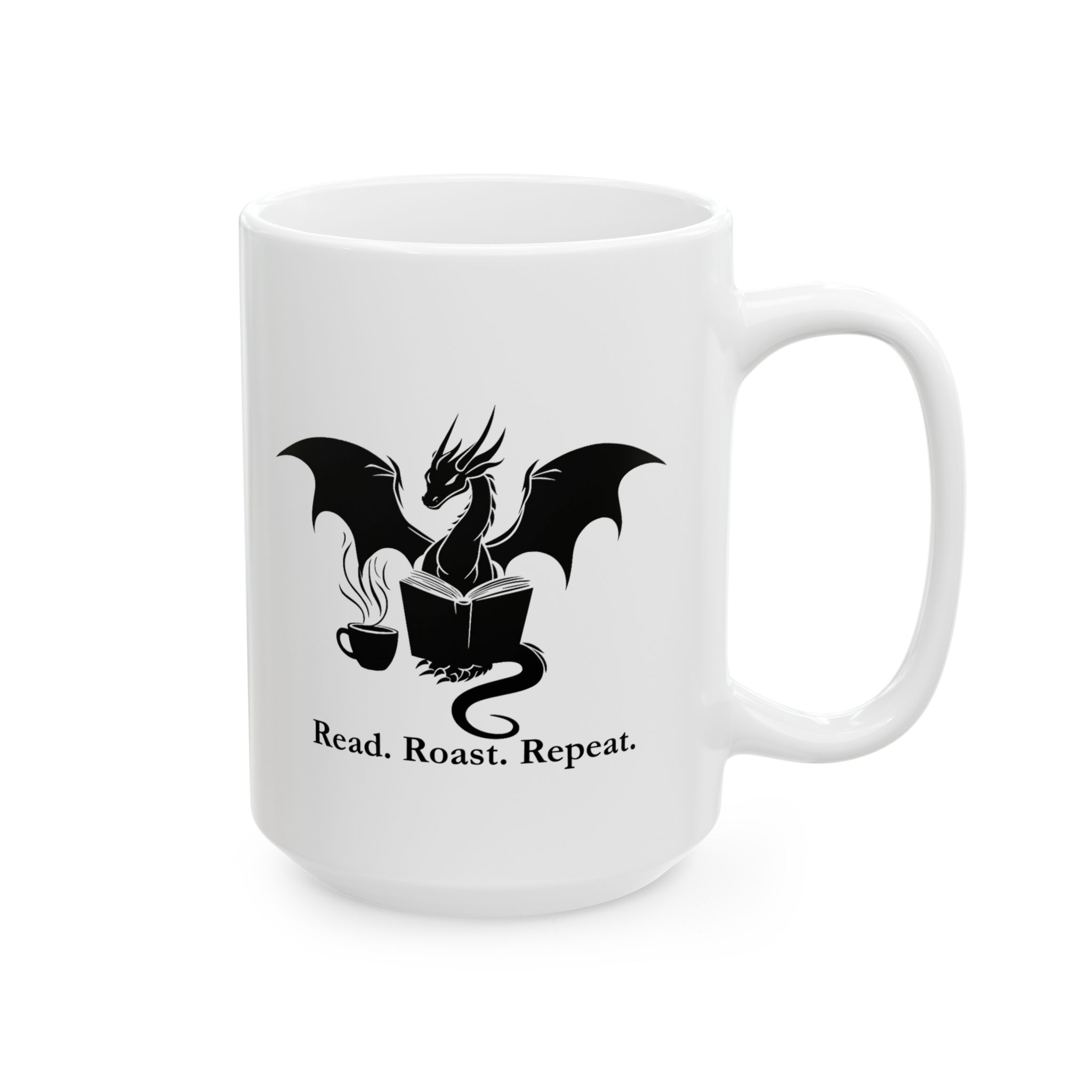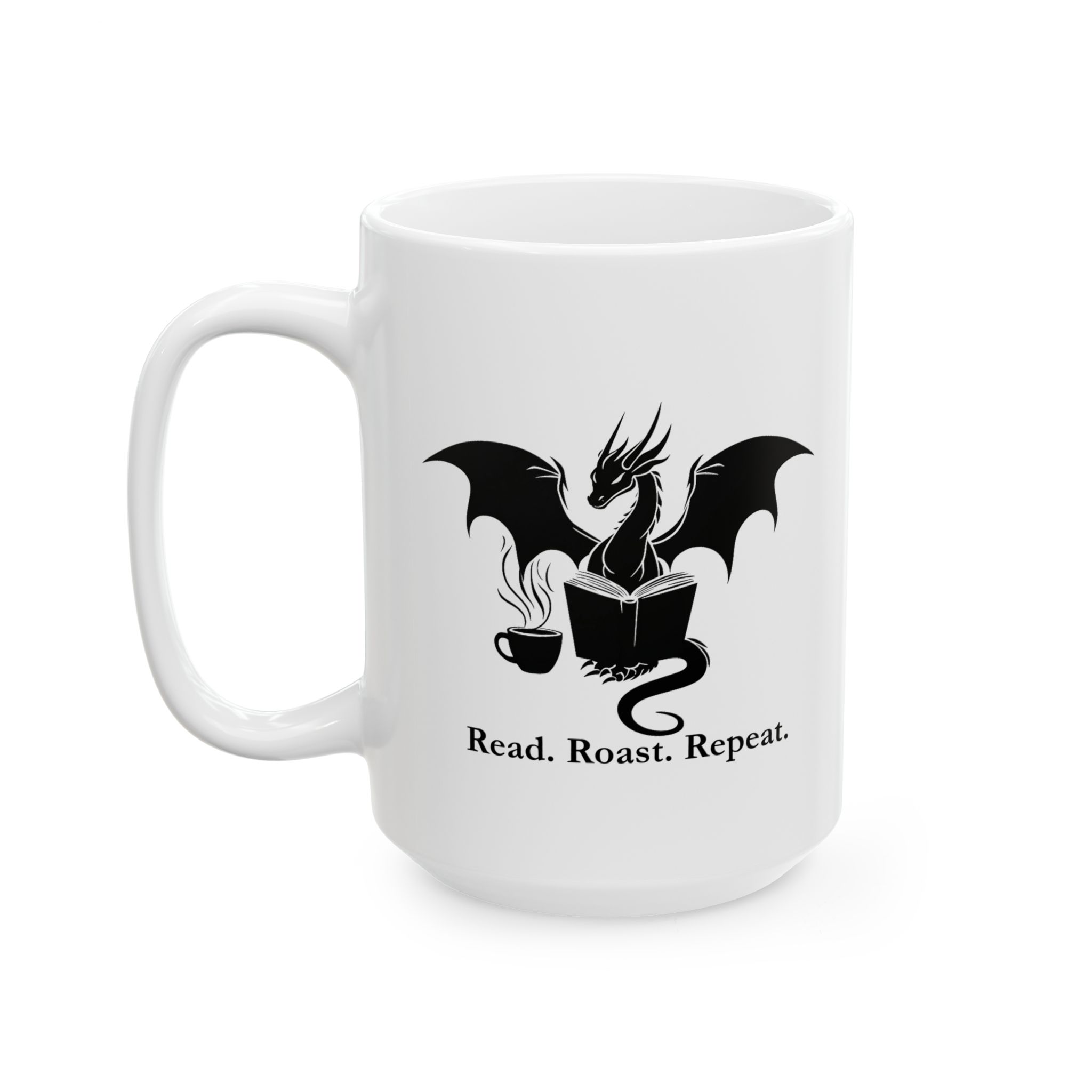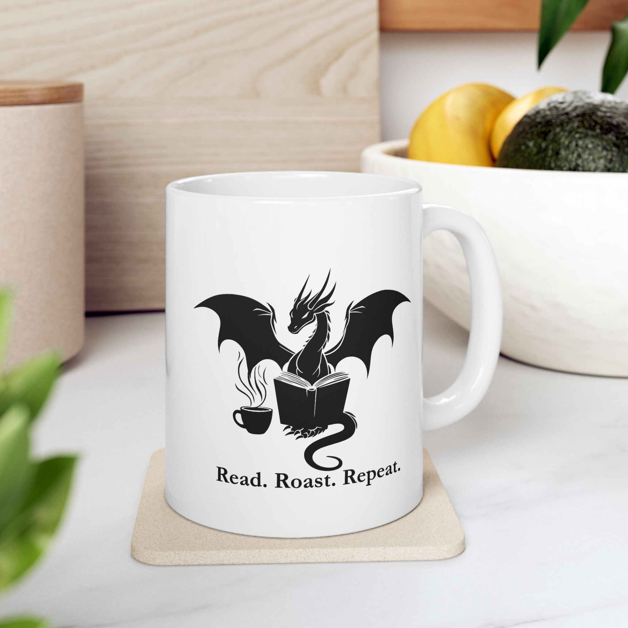 “Read. Roast. Repeat.” Dragon Coffee Mug — Fantasy Ceramic Cup (11oz & 15oz)