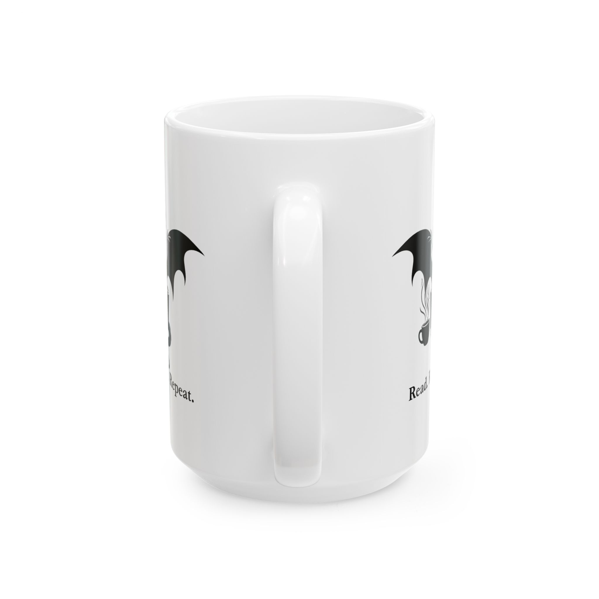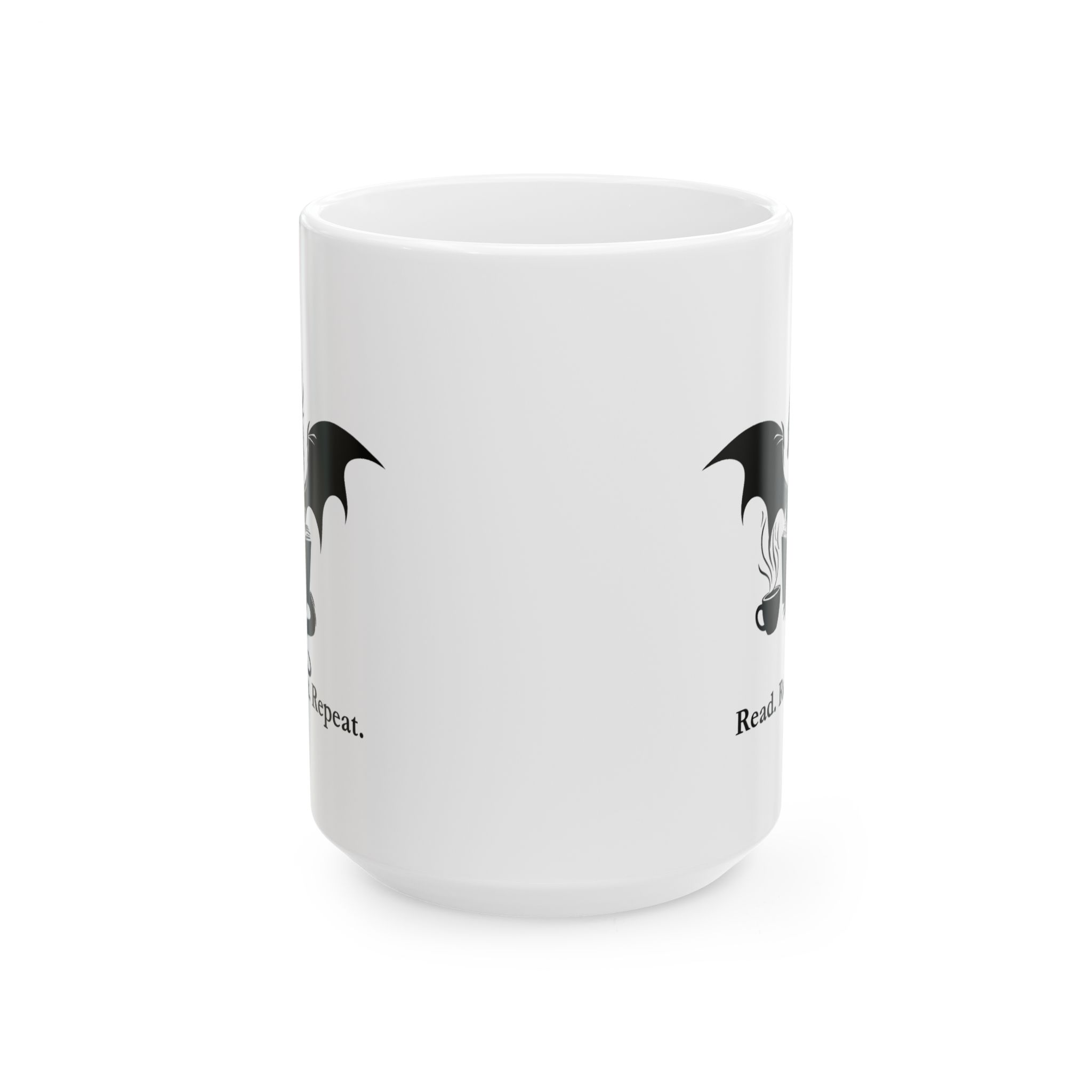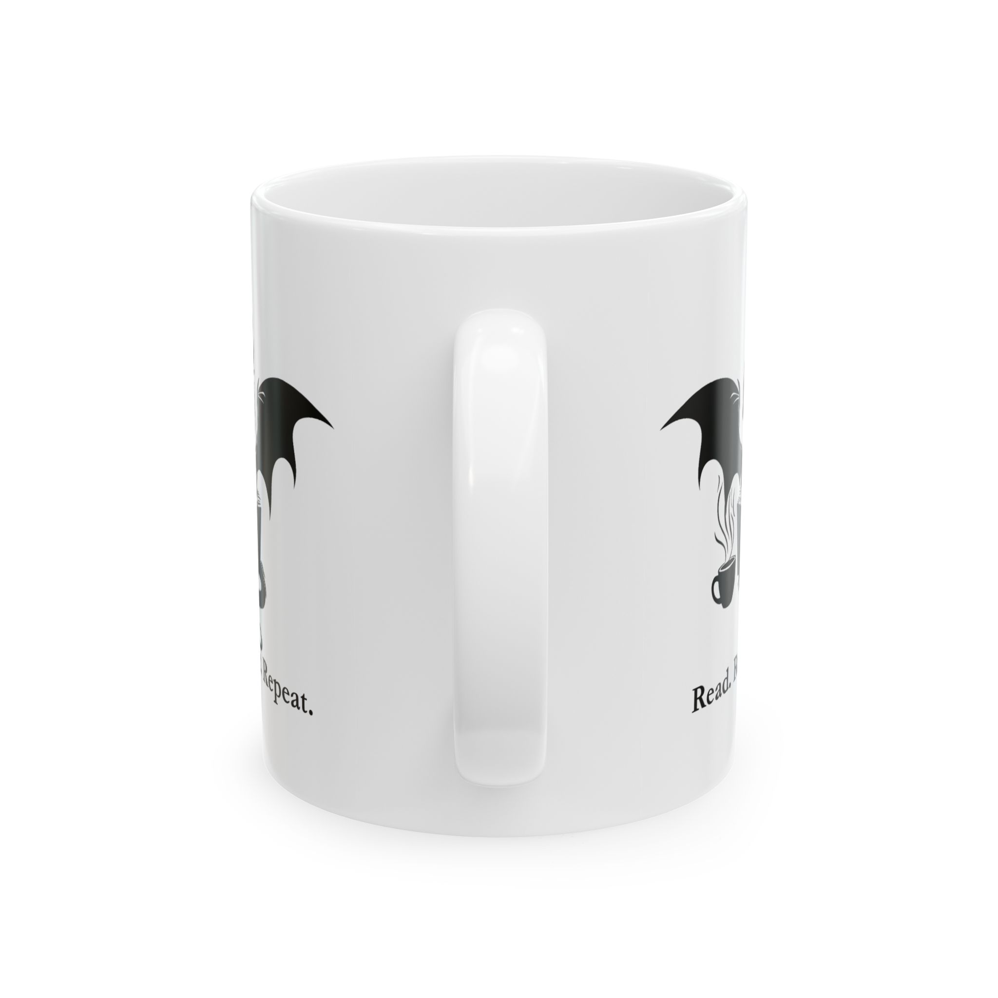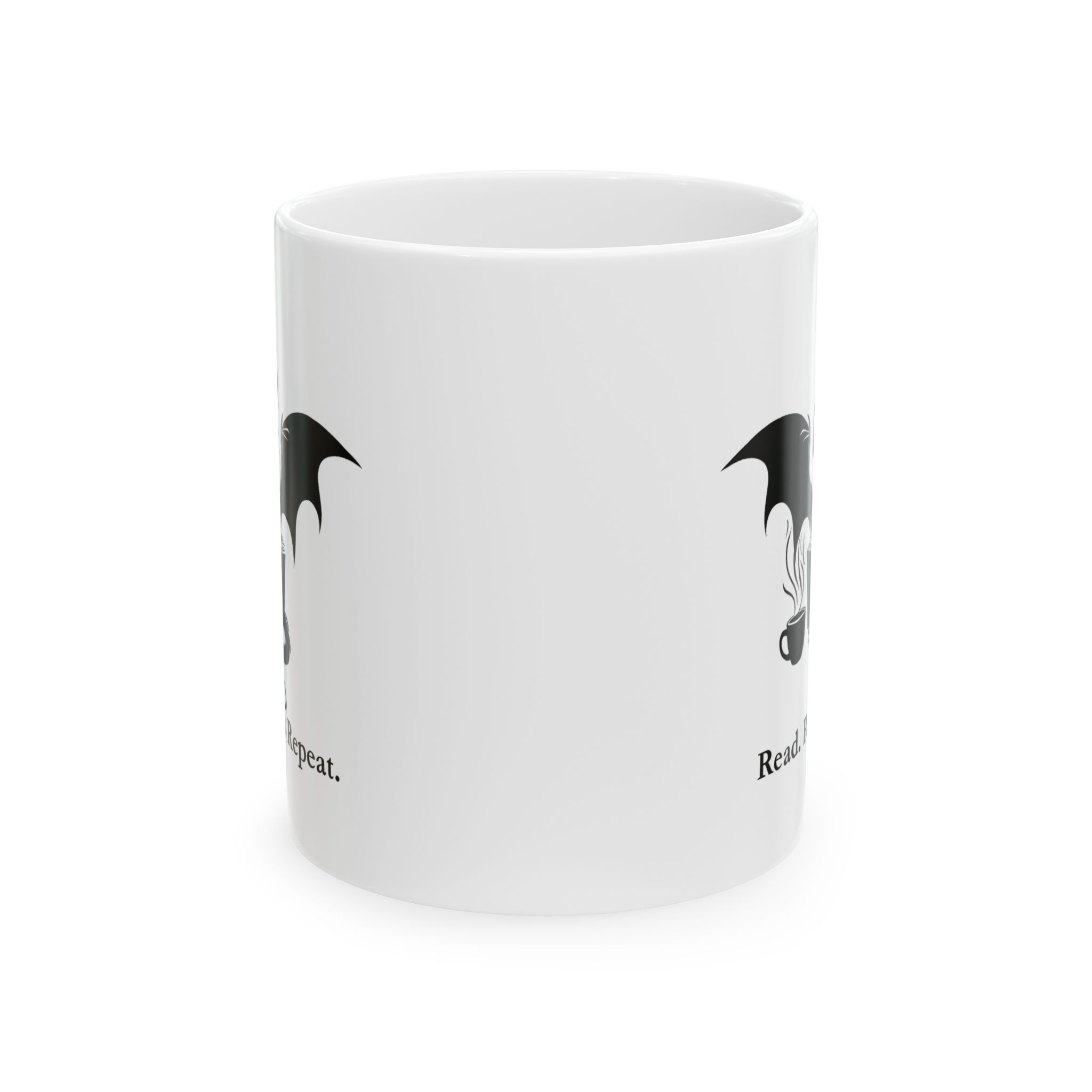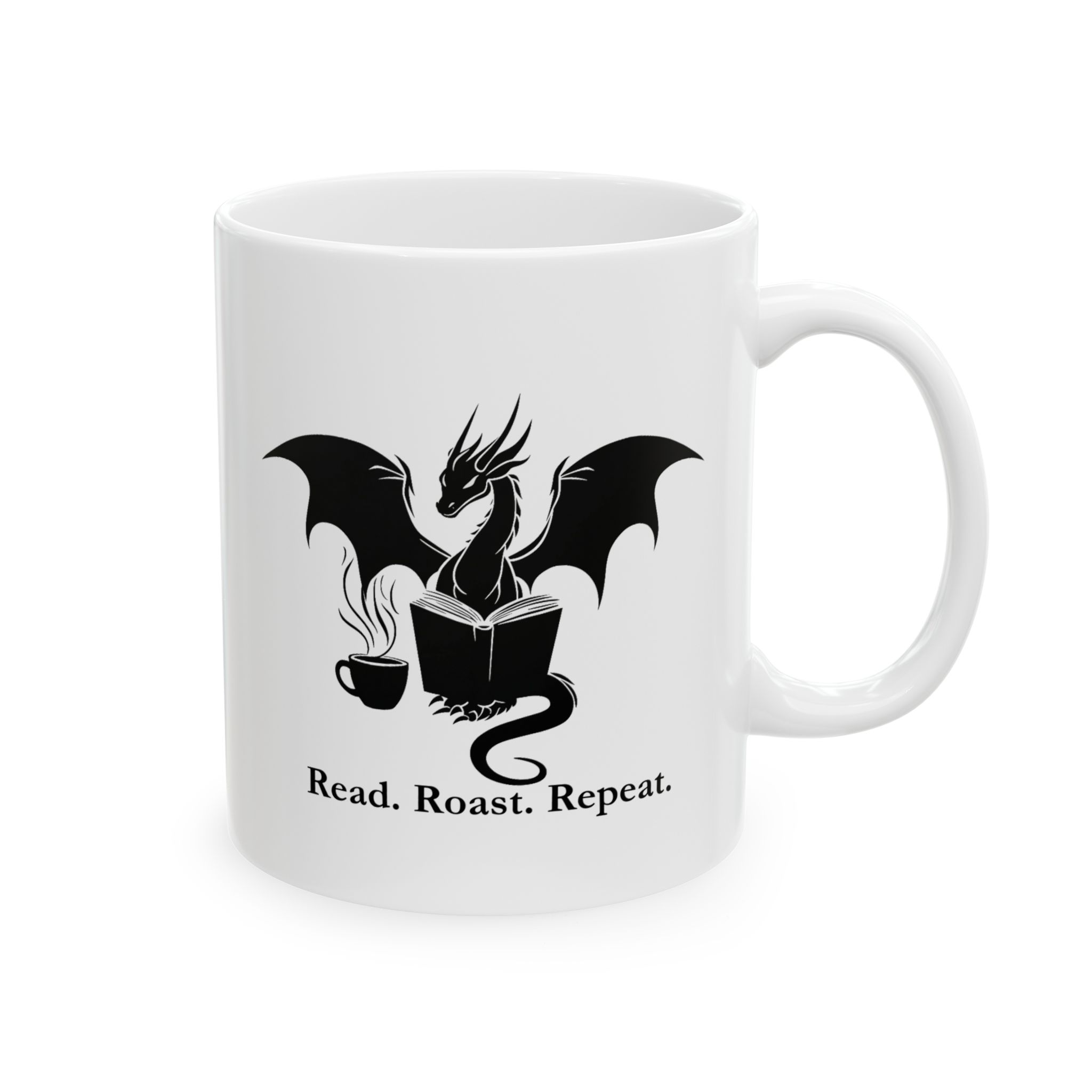 “Read. Roast. Repeat.” Dragon Coffee Mug — Fantasy Ceramic Cup (11oz & 15oz)