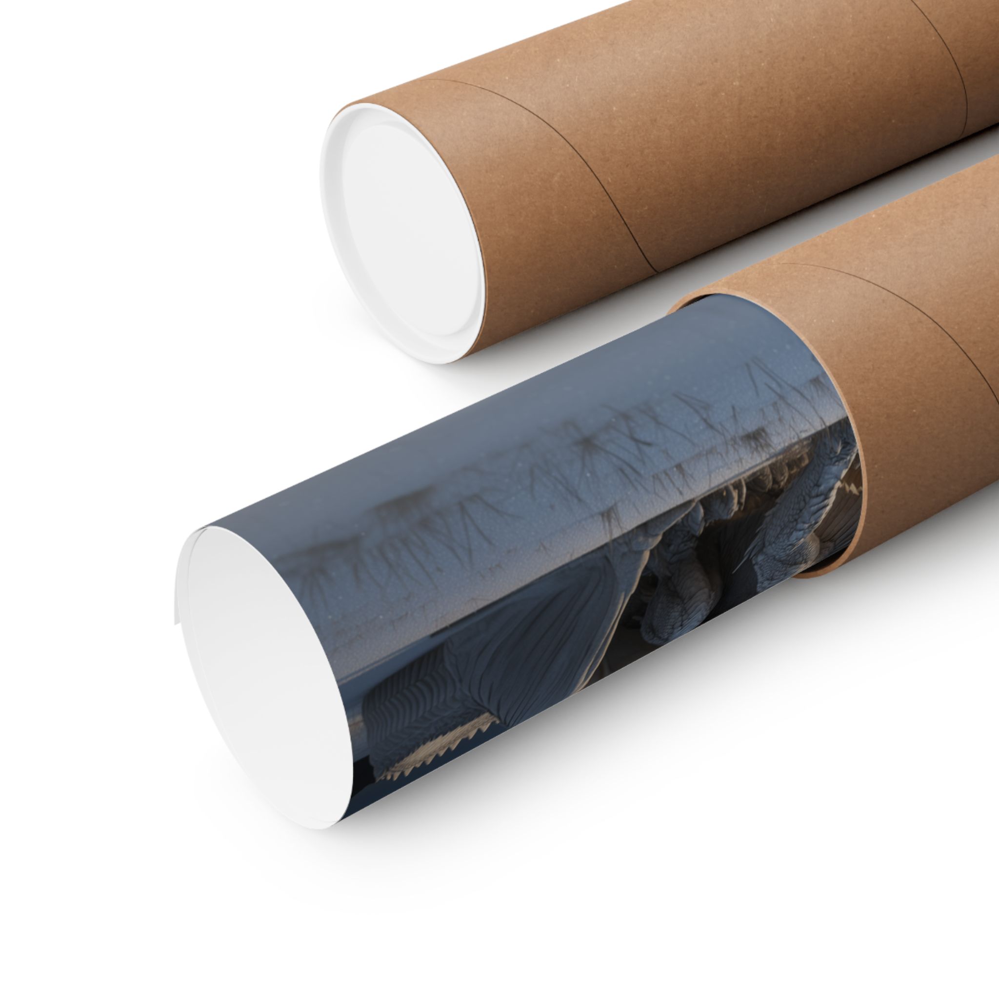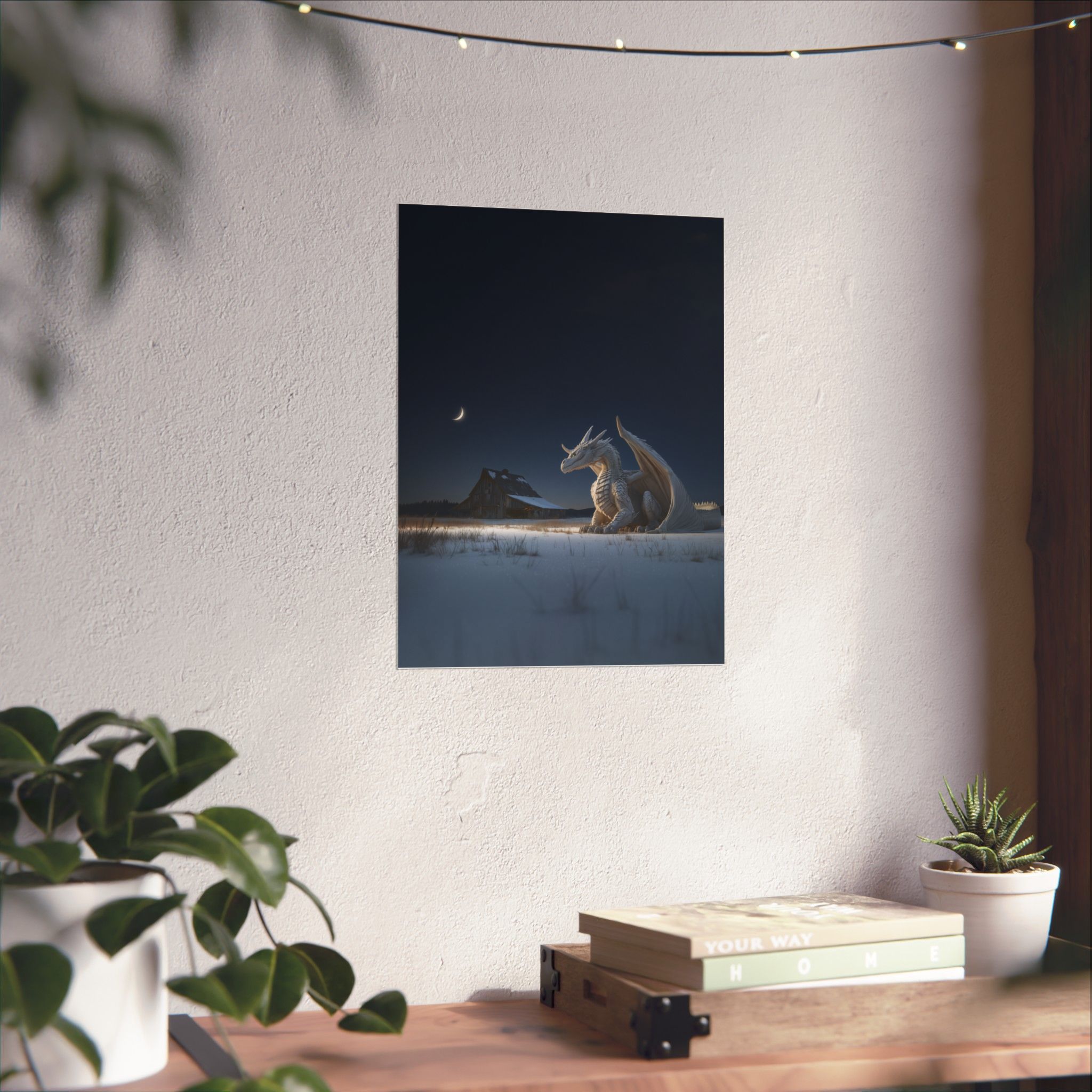 A quiet, cinematic poster that brings a hush of winter wonder to any wall. Under a quiet night sky, a winter moon dragon rests in a snowy field beside an abandoned barn — a scene that feels like the pause between heartbeats. The matte surface soaks up light, lending depth to midnight blues and soft highlights on the dragon’s scales. Hung over a reading nook, above a desk, or in a bedroom, this print invites lingering glances and late-night daydreams about myth and solitude.