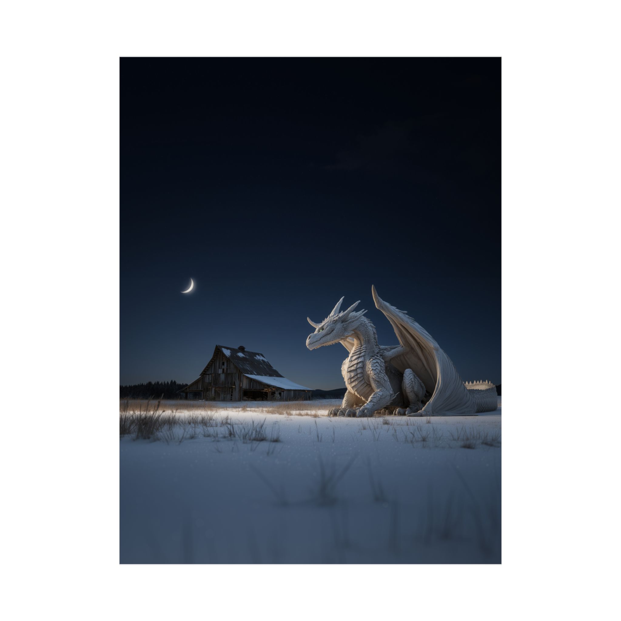 Winter Moon Dragon Poster – Vertical Matte Print – Peaceful Barn Scene