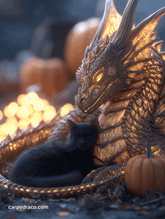 Long ago, when the veil between realms thinned in October, a pact was struck between Embercoil, a golden-scaled dragon of warmth and warding, and Nyx, a shadow-born cat whose purr could quiet restless spirits.